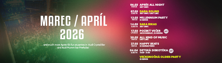 EVENTY JASNÁ Široká ponuka podujatí v Jasnej Strediskové podujatia V tejto sekcii nájdete: Aprés All Night 6.3.2026 Chopok Chutí Gopass Season Trophy Veľká noc je JASNÁ Ratrak Chutí Párty v Happy End Music Club V tejto sekcii nájdete: Dara Rolins Sara Rikas Všetky web-kamery Sledujte živý prenos internetovej webkamery a objavujte strediská spoločnosti Tatry Mountain Resorts a.s. Web-kamery →