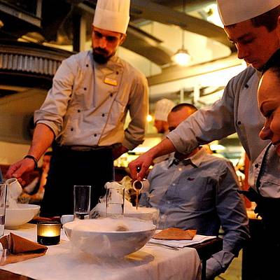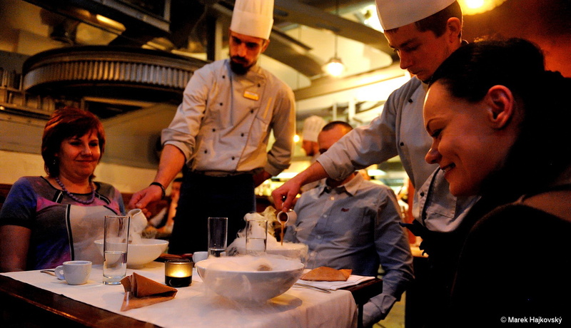 Už samotná cesta na večeru je zážitkom. Nastúpite do lanovky na Bielej Púti, ktorá vás vyvezie na Priehybu, kde prestúpite do špeciálne upraveného ratraku (Tatraku), ktorý vás prevedie zasneženou krajinou až do nadmorskej výšky 1670 m. Krásne výhľady, čistý horský vzduch a ticho prírody vytvoria dokonalý predkrm večera.