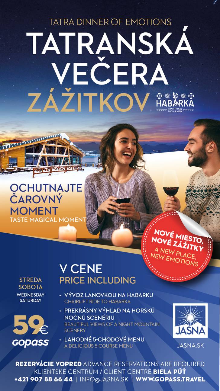 * Prevádzkovateľ si vyhradzuje právo zmeny určených dní a/alebo časov pre využívanie služby Tatranská večera zážitkov, ako aj zrušenie poskytovania služby Tatranská večera zážitkov, v určitých dňoch alebo celosezónne, a to kedykoľvek počas zimnej sezóny, a vrátane dňa, v ktorom sa má služba Tatranská večera zážitkov, v termíne do 12:00 hod. daného dňa z dôvodu nenaplnenia minimálnej kapacity a/alebo z akýchkoľvek prevádzkových dôvodov.