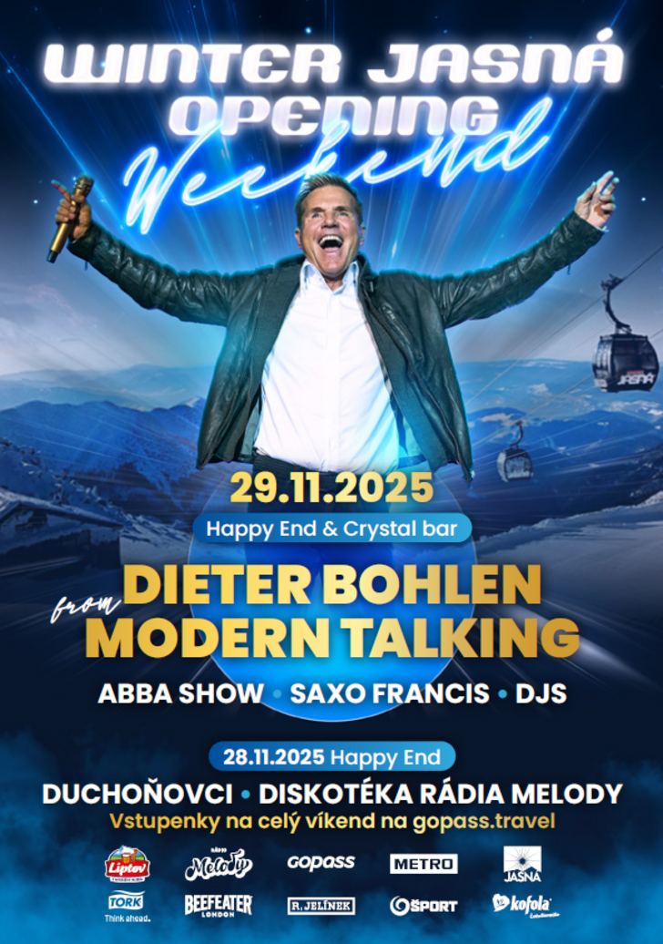 Počas posledného novembrového víkendu budeme v Jasnej otvárať novú lyžiarsku sezónu 2025/26! Tento rok sa zabavíme s hlavnou hviezdou DIETER BOHLEN - MODERN TALKING a čaká vás otváračka s bohatým denným aj večerným programom, ktorý začne už v piatok 28.11.2025.