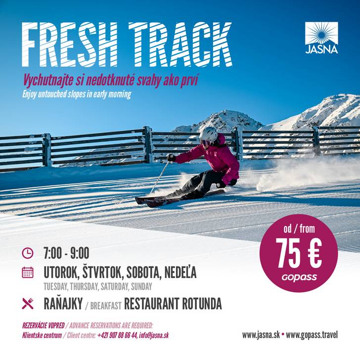 Fresh Track vám poskytne mimořádný zážitek z lyžování na prázdných sjezdovkách. Zalyžujte si ještě před oficiálním spuštěním lanovek. Kromě perfektně upravených tratí a vývozu lanovkami je v ceně zahrnuta i bohatá snídaně v horské panoramatické restauraci Rotunda přímo na svahu ve výšce 2 004 m n.m. Aktivita je vhodná pro dobré lyžaře, kteří si vychutnají jízdu carvingem na ranním "manšestru".