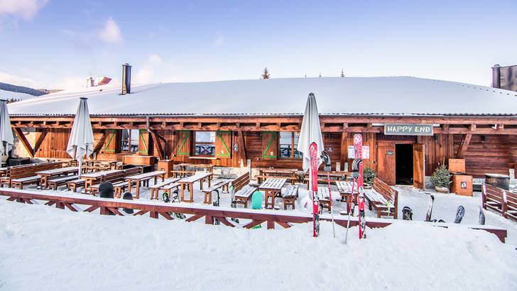 Oblíbená restaurace HAPPY END s rozlehlou terasou s výhledem na Chopok se nachází v blízkosti nástupní stanice lanovky /A6/ Biela Púť - Priehyba. Restaurační část se nachází ve stylovém dřevěném prostoru v poschodí. Příjemný velký interiér je určen pro oddych všem.