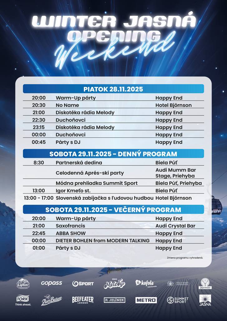 We’re opening the new 2025/26 ski season in Jasná on the last November weekend! This year, we’ll party with DIETER BOHLEN – MODERN TALKING as the main star, and you can look forward to an opening packed with a varied day and evening programme starting already on Friday, 28th November 2025.