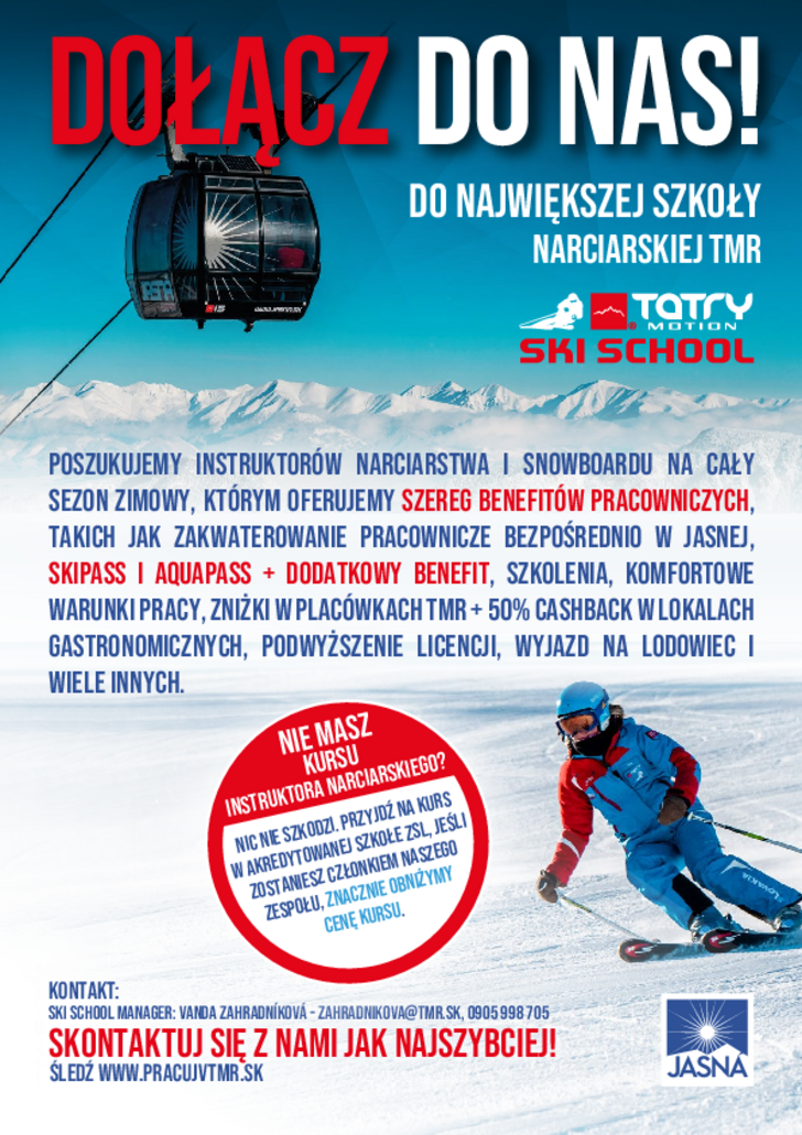 Jesteśmy największą szkołą narciarską na Słowacji, w ośrodku Jasna oferujemy lekcje dla narciarzy i snowboardzistów, od początkujących aż po doświadczonych narciarzy już od trzeciego roku życia. Nauka jazdy na nartach i snowboardzie prowadzona jest przez certyfikowanych instruktorów. Z usług szkoły narciarskiej można skorzystać w poniższych miejscach: Biela púť, Lúčky i Krupová po południowej stronie Chopoka. Każde z tych miejsc posiada własny teren treningowy zwany MAXILAND.